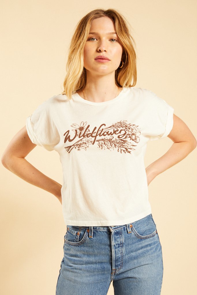 We're loving this classic tee with the most adorable "Wildflowers" graphic. It has a slightly cropped fit and rolled sleeves.