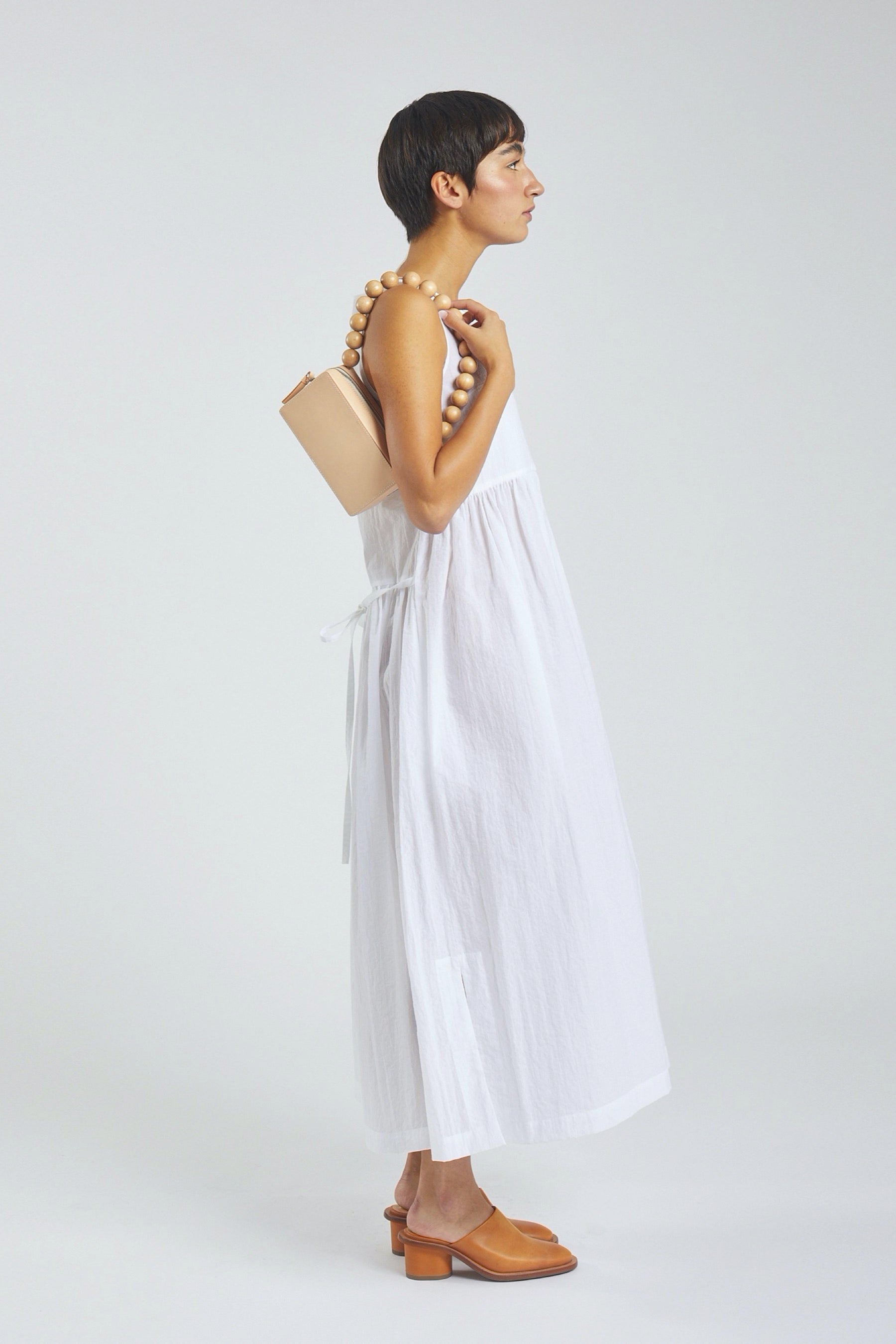 Structural brick shaped bag in Natural vegetable tanned leather, wood bead shoulder strap, silver zip closure.