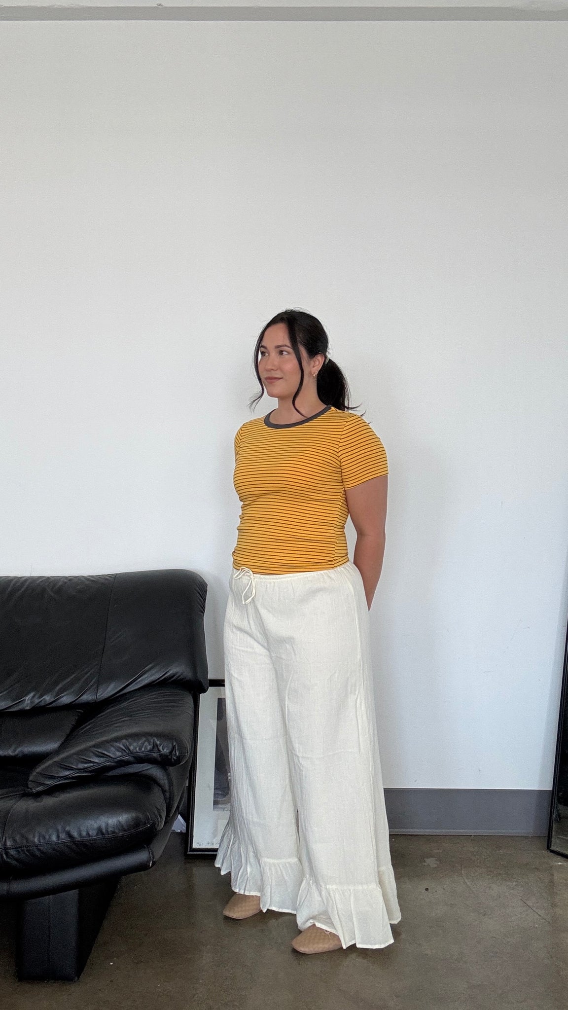 Introducing the Striped Basic Tee, the ultimate wardrobe staple that effortlessly combines style and comfort. This waistline cropped tee is designed to flatter your figure while providing a fun and casual look for any occasion.